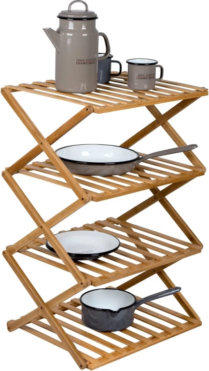 Een stevige en compacte legkast. Gemaakt van bamboe en door de scharnieren snel en eenvoudig in te klappen. Beschikt over 4 legplanken voor het opbergen van spullen. Kan worden gebruikt als schoenenrek of voor het opbergen van andere artikelen. Ideaal voor in de tent, maar ook voor thuis, bijvoorbeeld in de badkamer of op het balkon.